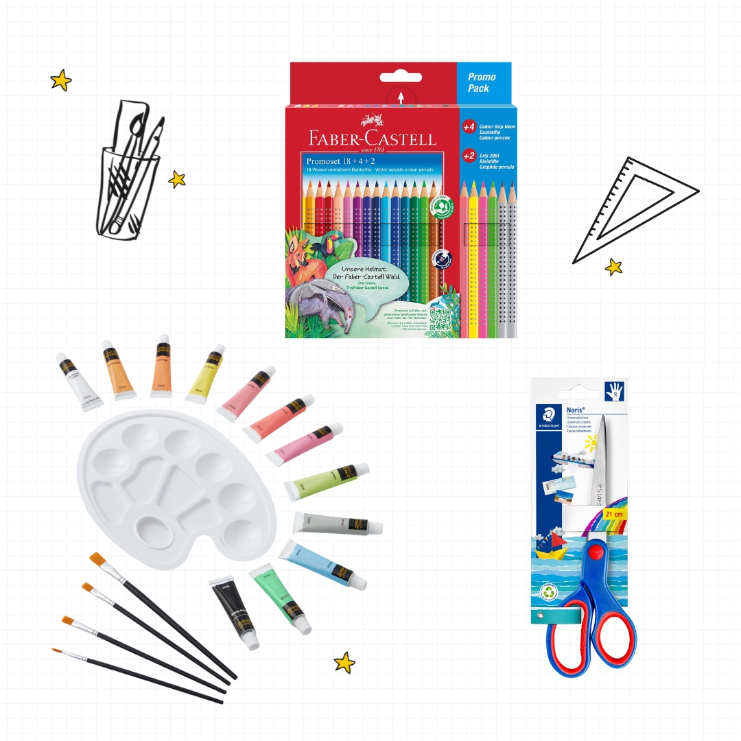 BOJICE, Müller/Faber Castell, 15,69 EUR; ŠKARE, Konzum/Staedtler, 1,49 EUR; AKRILNI SET ZA SLIKANJE, Pepco, 5,00 EUR