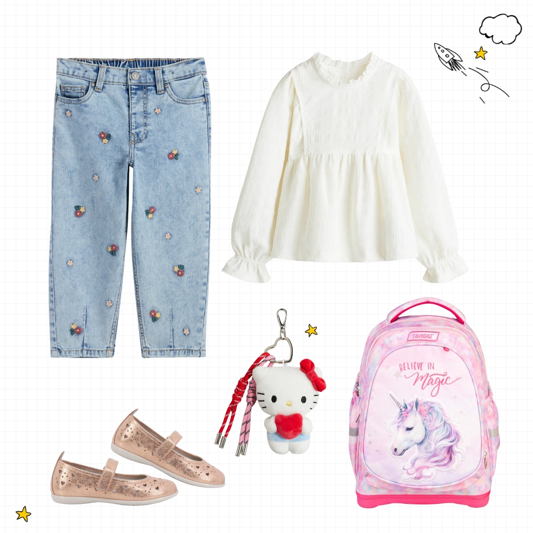 TORBA, Znanje/Targer, 34,79EUR; BAG CHARM HELLO KITTY, H&M, 8,99 EUR; HLAČE, C&A, 17,99 EUR; BALERINKE, Ciciban, 38,32 EUR; MAJICA, H&M, 13,99 EUR